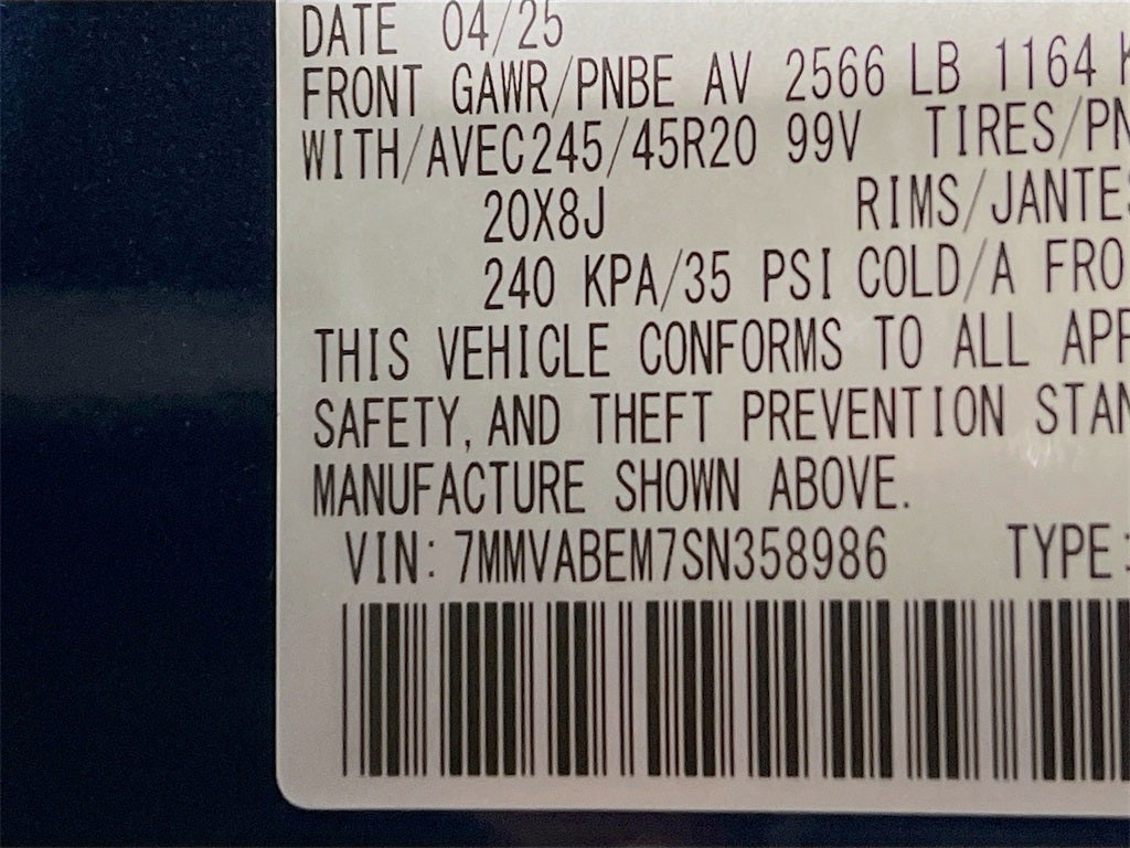 - Front Tire Size: P245/45HR20